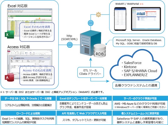 尚、現場でExcel同様普及しているAccessについても、dbSheetのオプション機能(Access対応コンポーネント「Access対応版」)を使って、DBの堅牢化、セキュリテイ機能付加、WAN対応、ADP資産の活用(救済)などが可能になります。