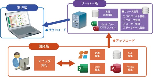 dbSheet EX11は「サーバー版」「実行版」「開発版」の3種類で構成されます。「サーバー版」では、DBアクセス制御、認証管理、権限管理、ログ管理、セッション管理などを行います。物理サーバーは、自社サーバーでもクラウドサーバーでも可能です。「実行版」には、各PCにExcelやAccessが必要ですが、プログラム情報であるロジック定義ファイル、Excelブック、Accessファイルは実行時にサーバーから自動ダウンロードされます。「開発版」では、定義編集、SQL編集、Excel編集、Access編集などを行い、デバッグを実行、その結果を「サーバー版」にアップロードして運用を行います。