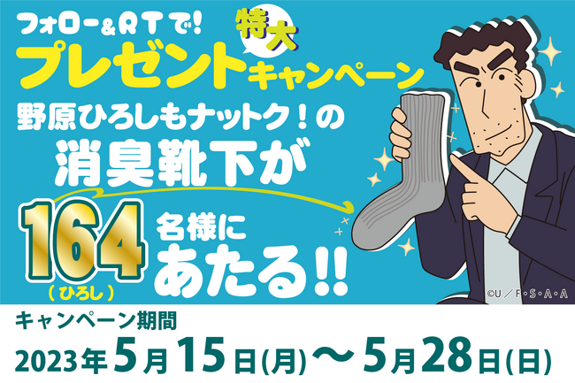 今年1月の発売と同時にSNS等でも話題となった人気アニメ「クレヨンしんちゃん」の主人公・野原しんのすけの父ちゃんで知られる“野原ひろし”の消臭靴下を、“野原ひろし”にちなみ164(ひろし)名様に抽選でプレゼントいたします。