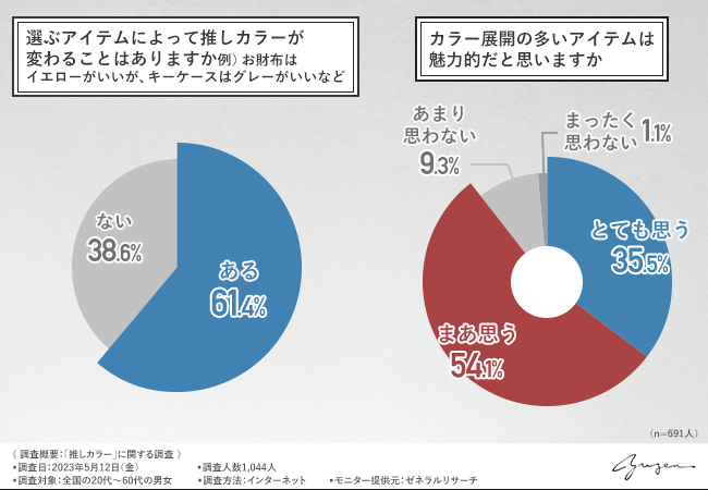 「選ぶアイテムによって推しカラーが変わることはありますか例)お財布はイエローがいいが、キーケースはグレーがいいなど」と質問したところ、6割以上の方が『ある(61.4%)』と回答しました。