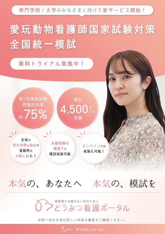 愛玩動物看護師国家試験の対策アプリ『どうぶつ看護ポータル』を提供する株式会社 and Vet (代表取締役;安岡恵斗)ならびに株式会社 qnote(代表取締役;鶴田展之) は、2024年7月より「愛玩動物看護師の国家試験対策 全国統一模試」を全国の教育機関と提携してスタートしました。現在までおよそ4,500名以上が受験した業界最大級の模擬試験を、全国の教育機関に向けて大幅リニューアルしました。本年度、既に30校以上の学校と連携し、全国的な模試を実施予定。興味のある教育機関の方々は、ぜひお気軽にお問い合わせください。