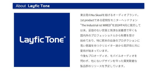 Layfic Toneはこのようなエンドースメント契約を通して、今後も国内外のプロデューサー、ミュージシャン、エンジニアたちのサポートに尽力して行く予定です。独自の視点から生み出される細部に渡るこだわりと突出した性能により、制作現場に改革をもたらし、時代を先取りするこの新ブランドを是非ご注目ください。