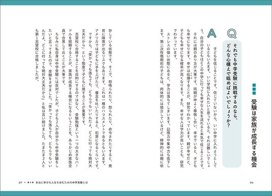 成功する子ばかりではなく、中学受験をしたばかりに、不登校になる可能性や、つらい思いをする可能性もあることを知ってもらい、親子が本当に幸せになる選択をしてもらいたいと思っています。(「おわりに」より)