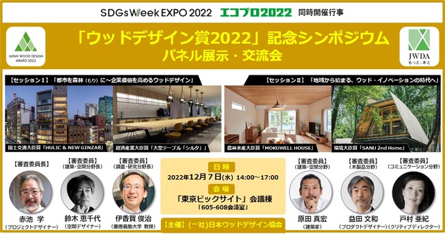 また、12月7日(水)午前には『エコプロ2022』の「特設ステージ」で上位賞の「表彰式」を、午後には会議棟で、最優秀賞受賞者や審査委員が登壇した『記念シンポジウム』、「ウッドデザイン賞2022」受賞者等による『パネル展示』および来場者との『交流会』を開催します。