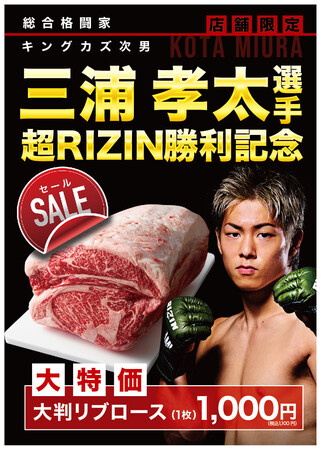 総合近江牛商社の公式アンバサダーである総合格闘家の三浦孝太氏の超RIZINでの、ブンチュアイ・ポーンスーンヌーン戦の勝利を記念して、大判リブロースを通常2,980円のところを1,000円で販売いたします。