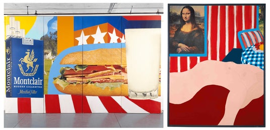 [left] Tom Wesselmann, Still Life #36, 1964, Found, paper, oil, and acrylic on linen, four sections, 304,8 x 488,3 cm, Whitney Museum of American Art, New York; Gift of the artist, (C) Adagp, Paris, 2024, photo: (C) Digital image Whitney Museum of American Art / Licensed by Scala [right] Tom Wesselmann, Great American Nude #31, 1962, Oil and mixed media collage on wood, 152,4 x 121,9 cm, Private collection, (C) Adagp, Paris, 2024