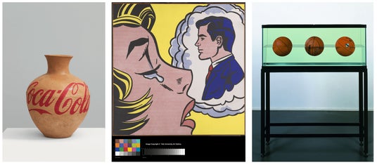 [left] Ai Weiwei, Han Dynasty Urn with Coca Cola Logo (tan), 2015, 43,1 x 30,4 cm, Collection Larry Warsh, (C) Ai Weiwei [middle] Roy Lichtenstein, Thinking of Him, 1963, Magna on canvas, 172,7 x 174,6 cm, Yale University Art Gallery, Gift of Richard Brown Baker, B.A.1935, (C) Estate of Roy Lichtenstein New York / Adagp, Paris,2024 [right] Jeff Koons, Three Ball 50/50 Tank (Wilson Agressor, Wilson Supershot, Dr. J. Silver Series), 1985, Glass aquarium on painted metal base, demineralized water, and three basketballs, 154 x 124 x 34 cm, Fondation Louis Vuitton, Paris, (C) Jeff Koons