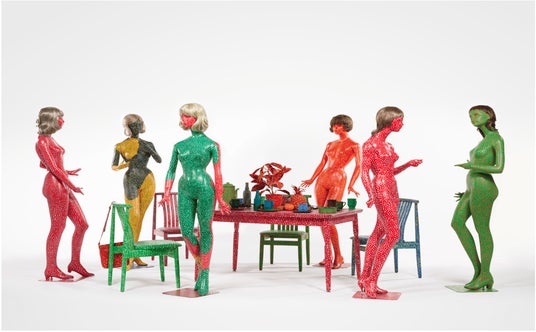 Yayoi Kusama, Self Obliteration, 1966-1974, Painted mannequins, table, chairs, wigs, handbag, mugs, plates, pitcher, ashtray, and plastic plant, fruit, and flowers, Variable dimensions, M+, Hong Kong, (C) 2024 Yayoi Kusama, photo: Courtesy M+, Hong Kong