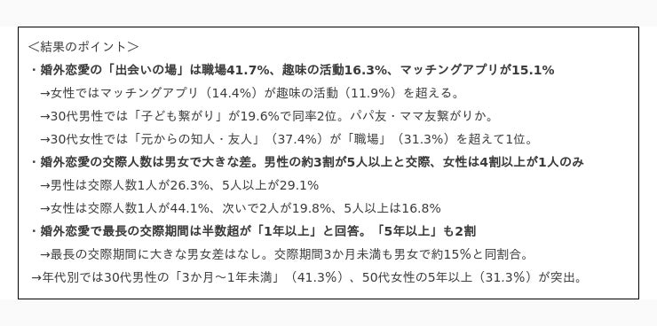 ⇒第1報:既婚者の22.5%に「婚外恋愛」の経験ありetc.