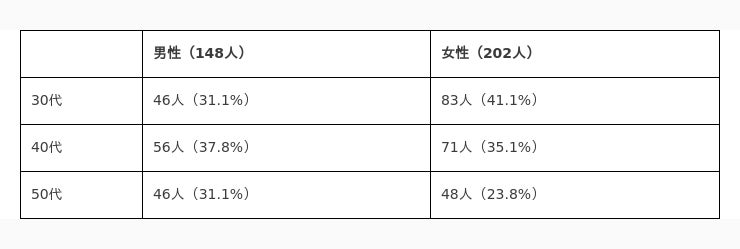 本調査は、この406人から抽出した婚外恋愛経験者350人を対象としたものです。回答者の男女比、年齢構成は下表の通りで、女性がやや多い、50代女性が少ないなどの点はありますが、比較的均等に分散したサンプルになっています。