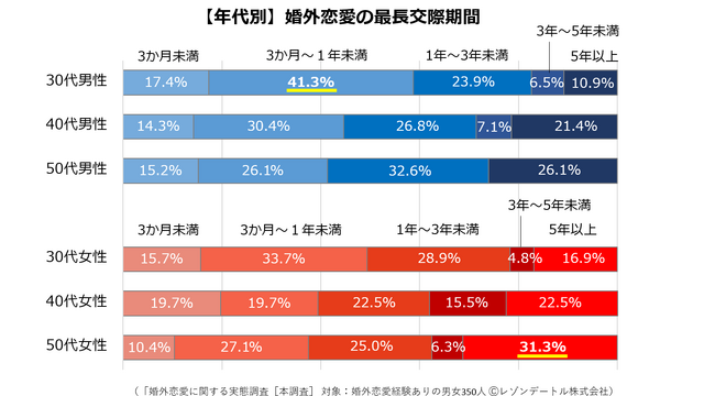 最後に男女それぞれを年代別にみたところ、次のグラフの結果となりました。30代男性の「3~1年未満」が4割を超える結果には「婚外恋愛を始めたばかり」の人も含まれるでしょう。50代女性の3割以上が「5年以上」という結果からは、「交際人数」でも言及した50代既婚女性の保守性が見て取れるかもしれません。