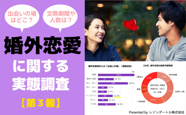 今回は「婚外恋愛経験者」に対象を絞った【本調査】の報告第1弾です。婚外恋愛の「出会いの場」「交際人数」「交際期間」などの実態が明らかになりました。