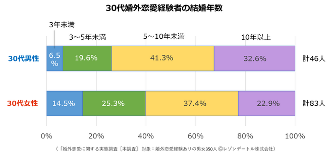 次のグラフの通り、対象者で一番若い層の30代を取り上げても結婚5年以上が6割を超えるなど、全体と同様に「ある程度の結婚年数を経てから恋愛に踏み切る人が多い」という傾向がみられます。