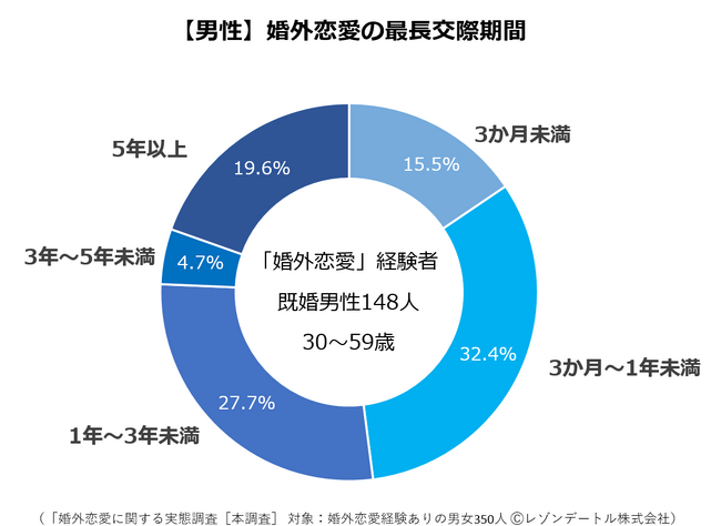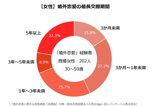 婚外恋愛の交際期間はどれくらいか──。お互い自由に会えない状況であり齟齬も多いと考えられるため、「短期間が多い」と想像されますが、実態はどうでしょうか。「過去最長の交際期間」を尋ねてみました。