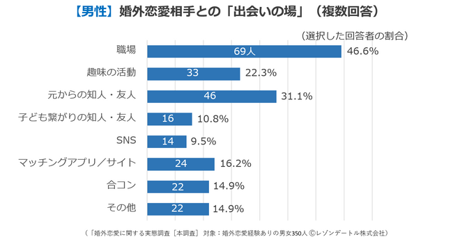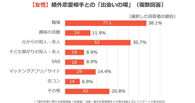 扶桑社の週刊SPA!編集部が2012年に既婚男女200人を対象として行った「不倫相手との出会いの場」アンケート調査(2012年、https://nikkan-spa.jp/168217)でも職場が1位で40%(男性40%、女性36%)と同じ数字が出ているため、「職場が4割」はかなりの信憑性がありそうです。