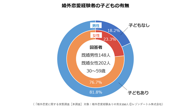 続いて、調査対象者の子どもの有無をみていきます。第1報では「子どもあり」の既婚者の方が婚外恋愛の経験割合が高いという結果を紹介しましたが、調査対象者の内訳でも実に約8割が「子どもあり」という結果になりました。