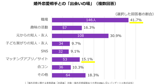 婚外恋愛経験者たちは、婚外パートナーとどこで知り合ったのか──。アンケートでは1位が「職場」(146人・41.7%)、2位「元からの知人・友人」(108人・30.9%)、3位「趣味の活動」(57人・16.3%)、4位「マッチングアプリ/サイト」(53人・15.1%)、5位「合コン」(36人・10.3%)、6位「子ども繋がりの知人・友人」(34人・9.7%)、7位「SNS」(32人・9.1%)との結果になりました。なお、該当する選択肢をすべて選ぶ複数回答方式です。