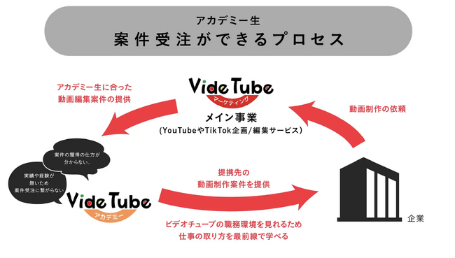 動画制作サービスを展開する株式会社ビデオチューブ(本社:東京都新宿区、代表:野苅家誠 https://vide-tube.com/)は、副業や手に職を持った働き方の実現をしたい人の増加に応え、ビデオチューブアカデミー卒業後のサポート制度の公開を行います。動画制作会社にしかできない「動画編集案件の受注経験」「仕事獲得サポート」「時代に合わせたスキル勉強会」の3つのサポート体制により、自立できる動画クリエイターが育つ環境を提供していきます。