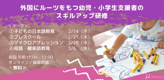 2024年2月14日(水)より、外国にルーツをもつ幼児・小学生を支援されている方に向けたスキルアップ研修を開催いたします(全4回)。