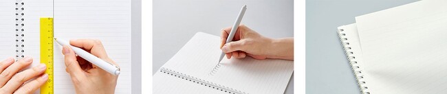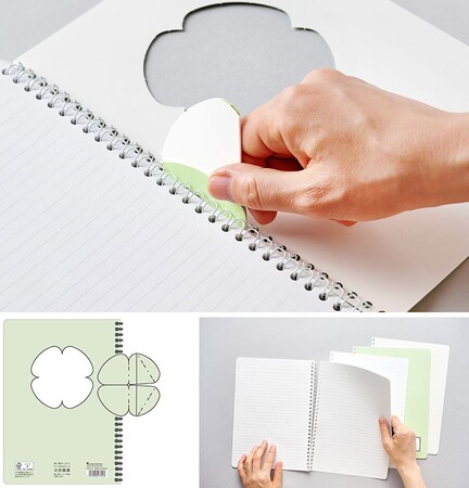 リングノートは、廃棄する際に、リングとノート本文の分別に手間がかかり、分別せずそのまま捨ててしまうという課題がありました。そこで、使用者の分別意識を高めるため、ノートの裏表紙には、オリジナルで開発し特許出願中の「リング開き」が付属しています。折りたたんで使用することで、リングの隙間を楽に広げられ、リングからノートの本文を簡単に取り外すことができます。