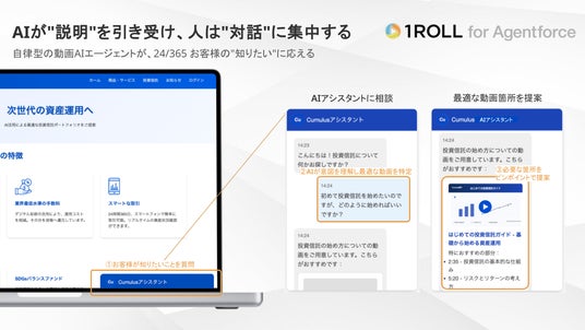 全社員がAIを「相棒」として活用し、定型的な説明業務や資料作成は「1ROLL for Agentforce」をはじめとするAI動画テクノロジーに委ねます。Salesforceに蓄積された顧客データと1ROLLの視聴行動データを統合し、「いつ・誰に・何を伝えるべきか」をデータドリブンで判断。人間は、顧客が最も助けを必要とする瞬間に、最高の熱量で寄り添う「コンサルタント」に専念します。