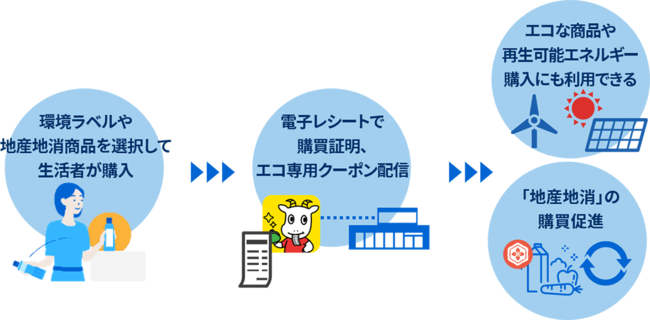 今回受賞したデータ活用によるDXサービスは、東芝グループが提供する電子レシートサービス「スマートレシート(R)」を活用した東芝データによるエコ商品の可視化や地産地消の購買促進です。利用者が環境ラベルや地産地消商品を選択して購入することで、エコな活動に対しての専用クーポンを配信し、利用者が自ら環境に配慮したり地元の経済活性化につながる商品を選択しやすくする社会の実現を目指します。