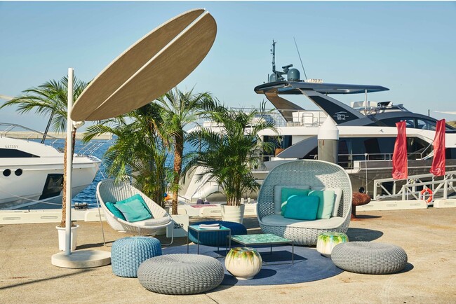 すべての素材が再生利用可能でサステナブルなPaola Lentiのアウトドア家具で設えたリラックス空間も登場。