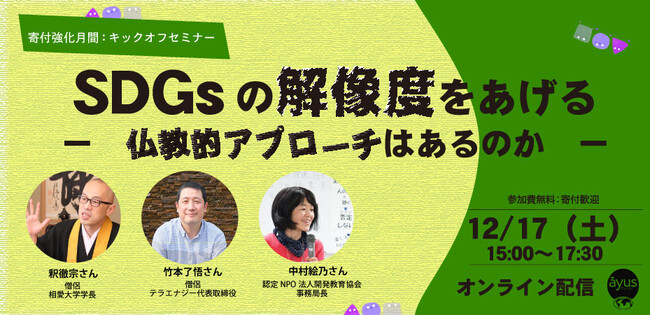 宗派を超えた仏教僧侶による国際協力NGO「アーユス仏教国際協力ネットワーク」は、12月17日(土)にオンラインセミナー「SDGの解像度をあげる~仏教的アプローチはあるのか」を開催します。基調講演に相愛大学学長の釈徹宗先生をお迎えし、社会活動に携わる仏教者、教育分野から社会の変革に携わるNGOスタッフを交えてのパネルディスカッションから、私たちがSDGsをより具体的に捉え、一歩を踏み出す方法を見出します。仏教者とNGO、市民をつなぐことで、より良い社会の実現を目指すNGOの強みを生かした、SDGsが目ざす「社会の変革」を心の変革と社会の変革の両面から問いかけるセミナーです。