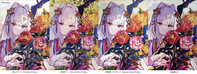 GASHO2.0 はレリーフ・ペインティング技術を応用して、アルミ板に何層も重ねて塗装することで立体的な表現を可能にする出力技術を有し、DNP は長年培った印刷技術を強みとし、作品の色味を忠実に再現するカラーマネジメント技術や作品の世界観を豊かにする多様な表現技術を有しています。