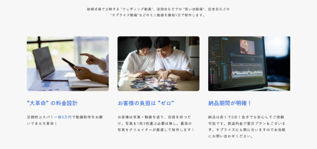 結婚式場で上映する "ウェディング動画"や送別会などでの "思い出動画"、記念日などでの "サプライズ動画"などのミニ動画を「一律3万円」で「最短1日」で制作します。