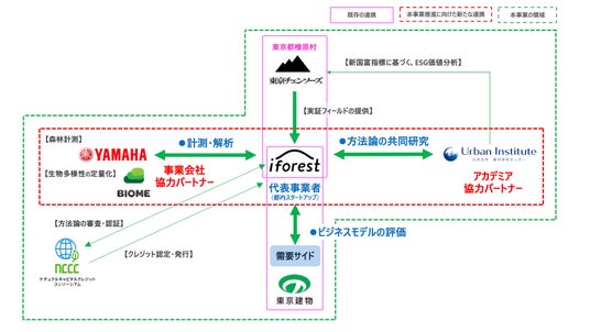 iforestを中心に、ヤマハ発動機株式会社*2(以下、ヤマハ発動機)、株式会社バイオーム*3(以下、バイオーム)、東京建物株式会社(以下、東京建物)*4、一般社団法人ナチュラルキャピタルクレジットコンソーシアム*5(以下、NCCC)、国立大学法人九州大学都市研究センター*6(以下、九大UI)の6者が産学連携し、東京都多摩地域の森林を対象に、超高精度なCO2吸収量、および生物多様性の定量的価値の算定方法を開発します。この取組みにより、東京を舞台に、世界に先駆けた新たな吸収・除去系カーボンクレジットの創出を目指します。