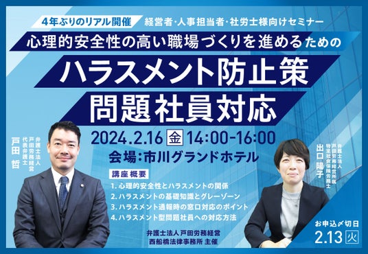使用者側労務問題に精通した弁護士法人戸田労務経営(所在地:千葉県船橋市)が、「ハラスメント・問題社員」を題材 に、4年ぶりのリアルセミナーを 2024 年 2 月 16 日(金)に市川グランドホテルにて開催いたします。