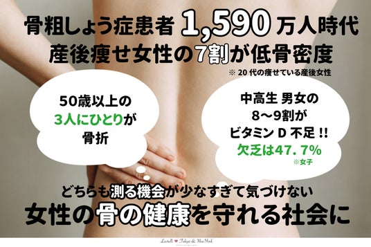 一般社団法人ラブテリ(中央区日本橋 代表:細川モモ、以下ラブテリ)は、成長期のピークボーンマス(最大骨量)のサポートと、産後低骨密度・産後骨粗しょう症予防を通じて女性と子どもの骨の健康に寄り添い、毎年1,590万人がなるといわれる骨粗しょう症とそれにともなう莫大な介護医療費の予防・適正化に取り組みたいと考えています。