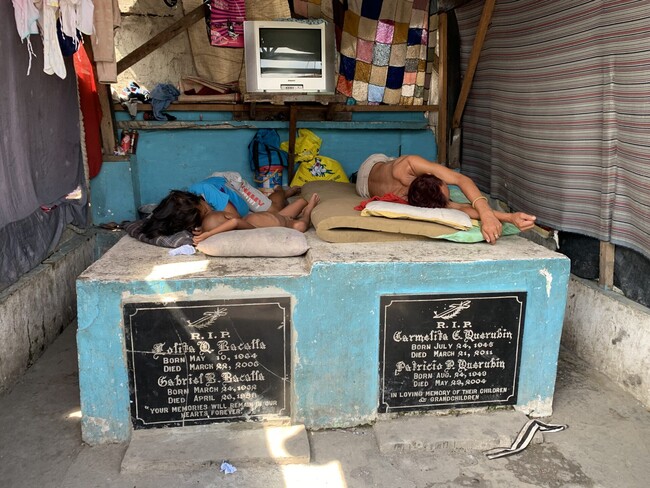 墓地に住む人々は、まだ遺体の安置されたままの棺桶をベット代わりに生活しています。墓地で、墓参客にお花やロウソクを販売したり、遺体を棺桶から移動したり、墓石を掘る仕事をしており、たとえ水道もトイレもない不衛生な場所でも、この地で生きるしかない人々です。