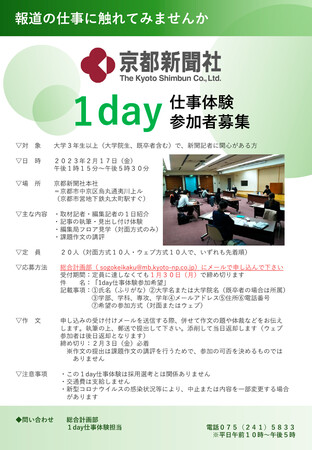 京都新聞社は、記者職に関心がある大学生向けに、1day仕事体験の参加者を募集しています。