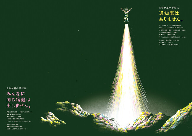 デザインと合わせて、「変な校則」の詳細説明ではさやか星小学校の教育方針・カリキュラム・ルール、そこにこめた想いなども紹介しています。