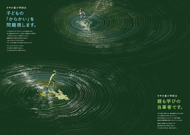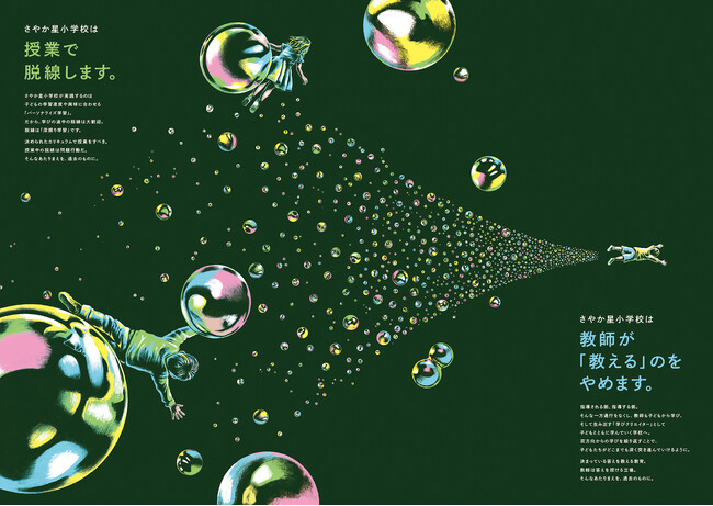 「変な校則」を紹介しているそれぞれのデザインでは、子どもたちが未来への羅針盤となる「星」に向かいながらも、新たな世界へ飛び出していく3つの様子を描いています。まるで、深海を勇敢にどこまでも突き進んでいく子どもたちの姿では、泡を何層にも重ねることで深さを出し、より一層深く考え行動に踏み切る力を身につけていく様子を表現しています。また、ロケットのように無限の宇宙へ飛び出していく子どもの姿は、力強い大量の噴射や広がっていく雲によって勢いを感じさせることで、自分自身の得意を伸ばし世界で飛躍していく様子を表現しています。そして、子ども同士それぞれの発する波紋が美しく交わっていく姿は、対人関係において自らが考えながら適切な距離をとり、お互いに影響を与え合いながら他者とのコミュニケーションの取り方を学び、成長していく様子を表現しています。