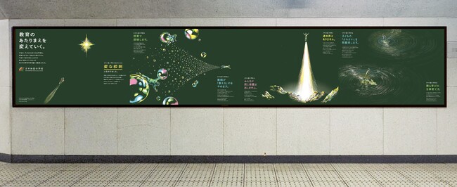 「教育のあたりまえを変えていく。」というメッセージに基づいた一風変わった決まりごとによって新たな世界へ自ら向かう子ども達を、教育の象徴である「黒板」と「チョーク」をモチーフとして活用し、子ども達の学びや育ちの軌跡を描いています。できないと思っていたことができるようになったり、行けなかったところへ行けるようになったりと、子ども達自身の可能性が開花し、新しい道を切り開き、新たな世界へ飛び出していく様子を表現しています。