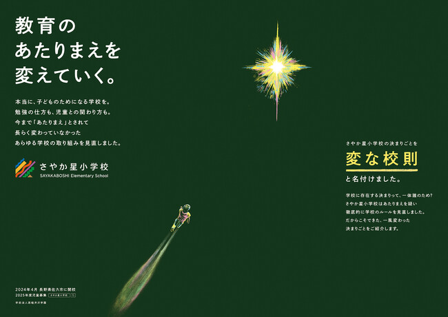 2024年4月に開校した長野県佐久市の「さやか星小学校」(運営:学校法人西軽井沢学園、所在地:長野県北佐久郡御代田町、理事長:奥田健次)は、「教育のあたりまえを変えていく。」という当校のメッセージに基づいた一風変わった決まりごとを「変な校則」と名付けて、長野県・軽井沢駅と東京・霞が関駅で公開いたします。軽井沢駅では6月24日(月)から6月30日(日)、霞が関駅では6月28日(金)から7月4日(木)にて掲出予定で、教育に関わるすべての方に向けて、現在の「教育のあたりまえ」に対する一石を投じる狙いをこめています。