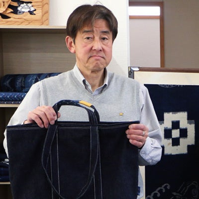 最も使い込まれるハンドル部分に主役である伊予かすりを使う意味には、伝統的な絣の織柄を目で見て触って楽しんでもらうことに加え、かつて野良着としてボロボロになるまで直しながら使われていたかすり本来の役割を、バッグの日常使いを通して体感してもらう狙いもあります。