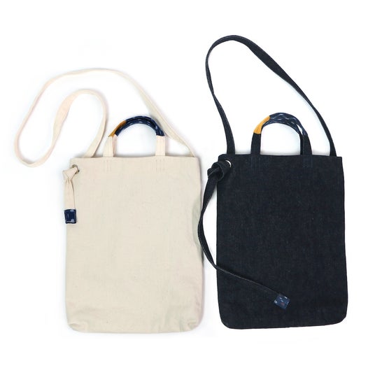 そこで、伊予かすりの持つ文化的なエッセンスを現代的な商品に落とし込み、伊予かすりの存在に触れてもらう機会をつくるべく、当社では白方興業との共同での商品開発に着手。伊予かすりの特徴的な柄をさりげないアクセントとして取り入れたトートバッグ/ショルダーバッグを開発しました。