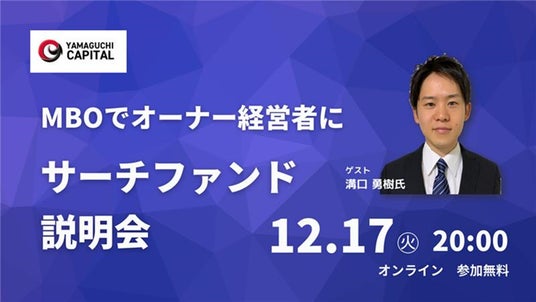 山口キャピタル株式会社(所在地:山口県、代表取締役:伊藤 忠志)は、「MBOでオーナー経営者に」をテーマに、12月17日(火)20:00より、参加無料のウェビナーを開催します。ゲストとして、国内で初めてサーチファンドMBOを実現された元サーチャーの溝口勇樹氏が登壇します。