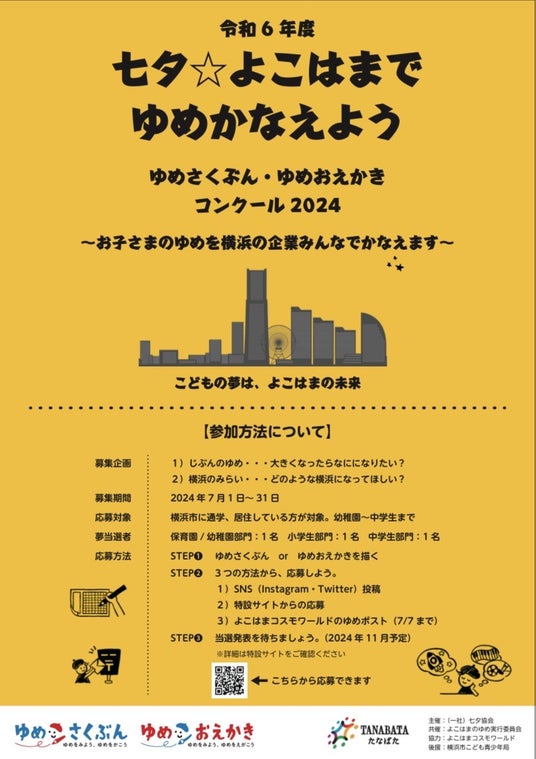 ご協賛・ご協力頂いた市内の多くの企業様、ご後援頂いた横浜市こども青少年局様には本当に感謝致します。夢が叶う瞬間の、お子様達のキラキラした目に、私たち大人も涙が出るほど感動しました。お子様達にどうしたら喜んでもらえるか、事前に色々とご準備下さったご協力企業様のご尽力の賜物です。2024年度もお子様の夢を横浜市の企業様のお力を借りて叶えます!ぜひ『七夕☆よこはまでゆめをかなえよう ゆめさくぶん・ゆめおえかきコンクール2024』へご応募お待ちしております。