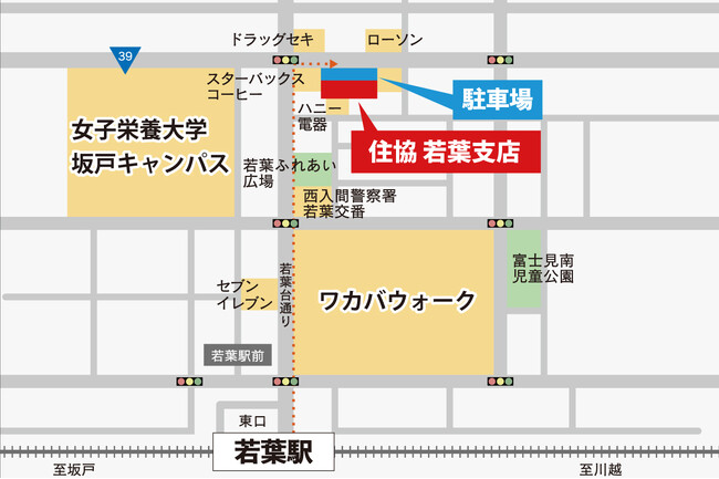 「住協若葉支店」は東武東上線「若葉」駅より徒歩5分、周辺にはショッピングモールやドラッグストア等が建ち並ぶ便利なエリアに店舗を構え、駐車場やキッズスペースも完備していますので、お子様連れ、お車でのご来店もしやすくなっています。