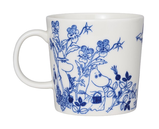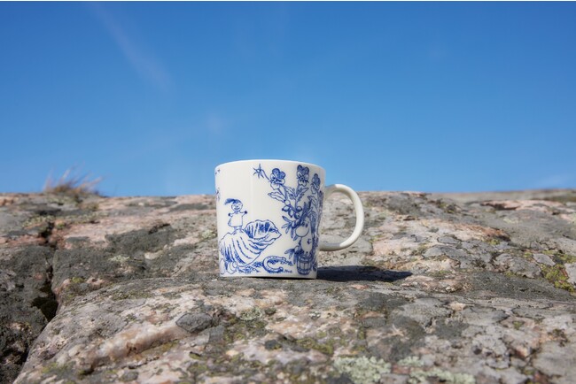 今年のマグは1965年に発表されたムーミンの最後から2番目の小説「ムーミンパパ海へいく」を題材にしています。この物語のなかで、ムーミン谷の平和すぎる毎日のなかで自分が必要ない存在になってしまったとムーミンパパが感じたことから、ムーミン一家は安全で慣れ親しんだムーミン谷から遠く離れた、自然に囲まれた灯台のある島に引っ越します。もともとヤンソンがファンへの返信用の便せんに描いていたイラストのトーンをもとに、トーベ・スロッテがアレンジしたデザインのマグには、島の海岸で過ごすムーミン、ムーミンママ、ムーミンパパ、ちびのミイが描かれています。スミレや野ばら、サジーや貝殻など風光明媚な島の風景とともに、シンプルな白地にインクを想起させる鮮やかなブルーの色で表現されており、爽やかな潮風が吹き抜けるようです。