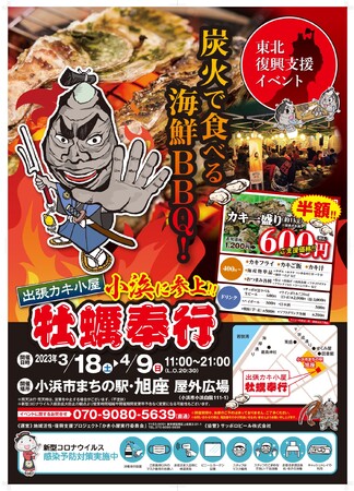 「牡蠣奉行」は東日本大震災で被災した宮城県石巻市の牡蠣をより多くの人に食べてほしいと東北復興支援イベントとして全国各地で展開。4月9日(日)まで毎日営業致します。