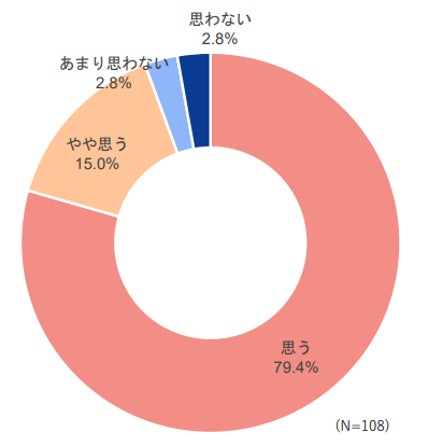 目黒川沿い区道の歩行者優先化について、「思う」「やや思う」と回答した方が 94.4%であり、大部分を占める方が肯定的な意見であった。