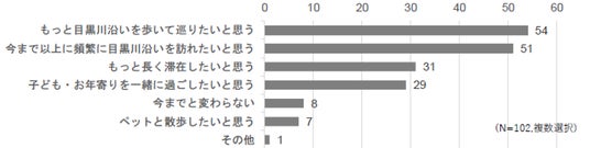 「今回の実証実験のように目黒川沿いの区道を歩行者優先道路化した場合に、目黒川沿いでの過ごし方は変化すると思いますか。」の問に対し、「もっと目黒川沿いを歩いて巡りたいと思う」と回答した方が54件と最も多く、次いで「今まで以上に頻繁に目黒川沿いを訪れたいと思う」が51件となった。