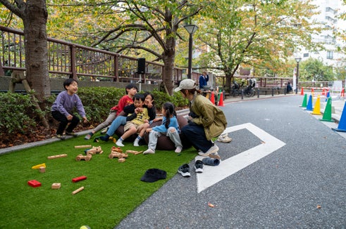 本企画は、目黒川沿いの区道をオープンスペースとして活用する社会実験「目黒川道プロジェクト」の一環として実施され、当日は老若男女を問わず、街の様々な人々が参加し、パン食い競走へ約400人、社会実験全体では約3000人もの人が集まりました。レースは4人1組で行われ、スタート地点から15メートル先に吊り下げられたあんパンに向かって全力疾走する姿が見られました。参加者たちは、合図とともに勢いよく飛び出し、沿道からは「ナイスパン!」「頑張れ!!」などの大きな声援が上がり、イベントは大いに盛り上がりました。また、競技後に芝生やテーブルセットを置き滞留空間として解放すると芝生の上で子供たちが遊び始め、親御さんがその姿を椅子に腰掛けてみている風景が見受けられました。イベントを通じて、目黒川沿いの区道が新たな交流の場として機能し、地域コミュニティ活性化への一助となりました。