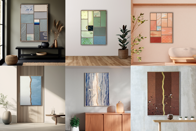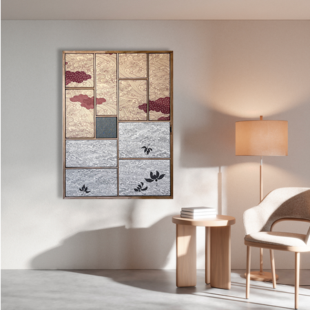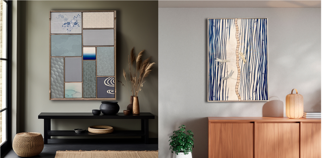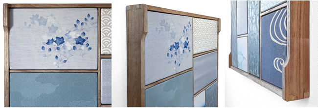 ikasuの最新作品は、桐ダンスの風合い、形状、質感などを最大限に活かし、額に用い、伝統的な着物の素材と独創的なデザインを融合させました。その素材に込められた歴史や感情を尊重しました。個性的で味わい深い作品をご覧ください。